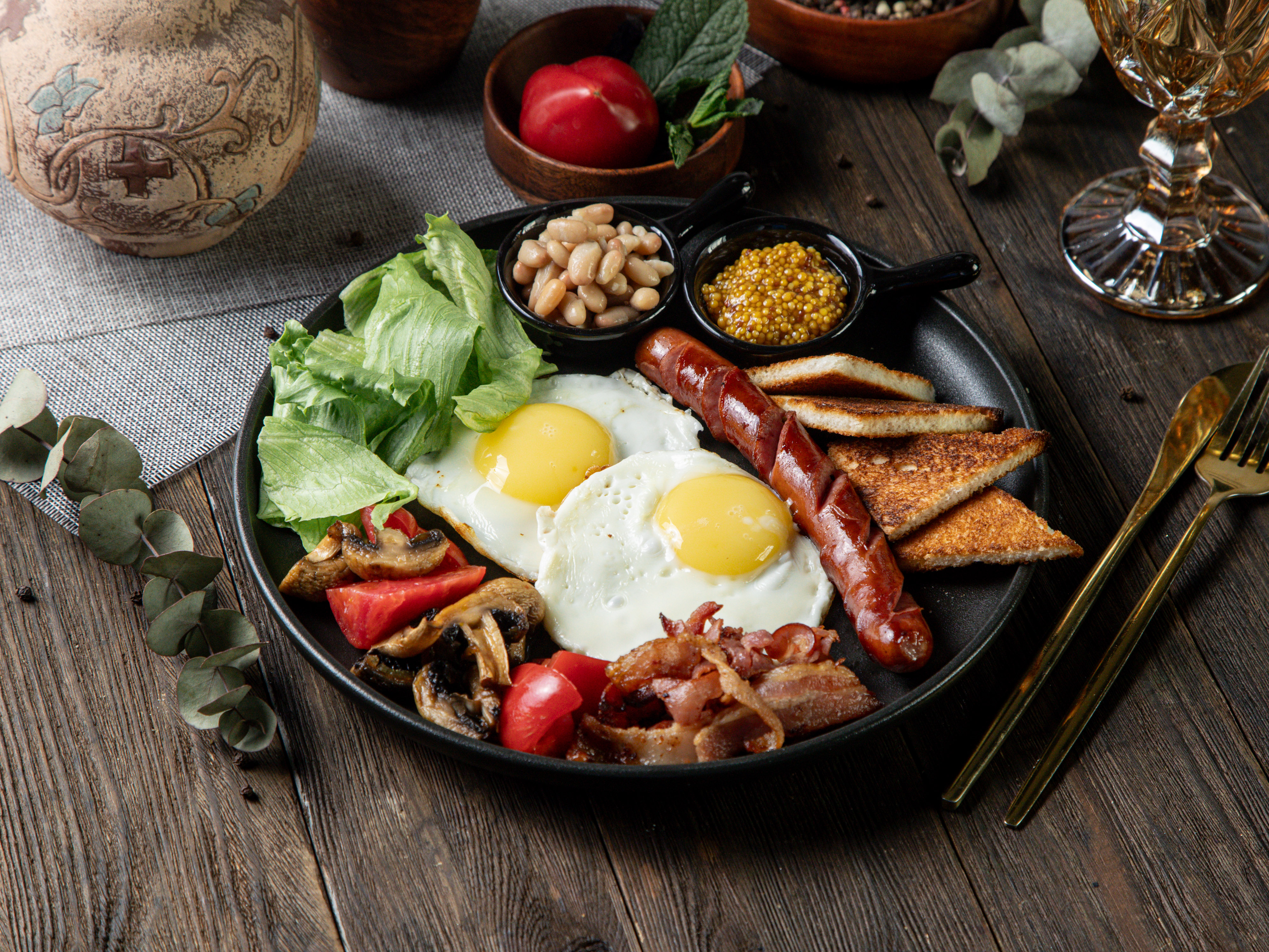 Глазунья из двух яиц с поджаренным беконом, помидорчиками, грибами, колбаской гриль и белой фасолью в собственном соку. Подается с хрустящими тостами и горчицей.