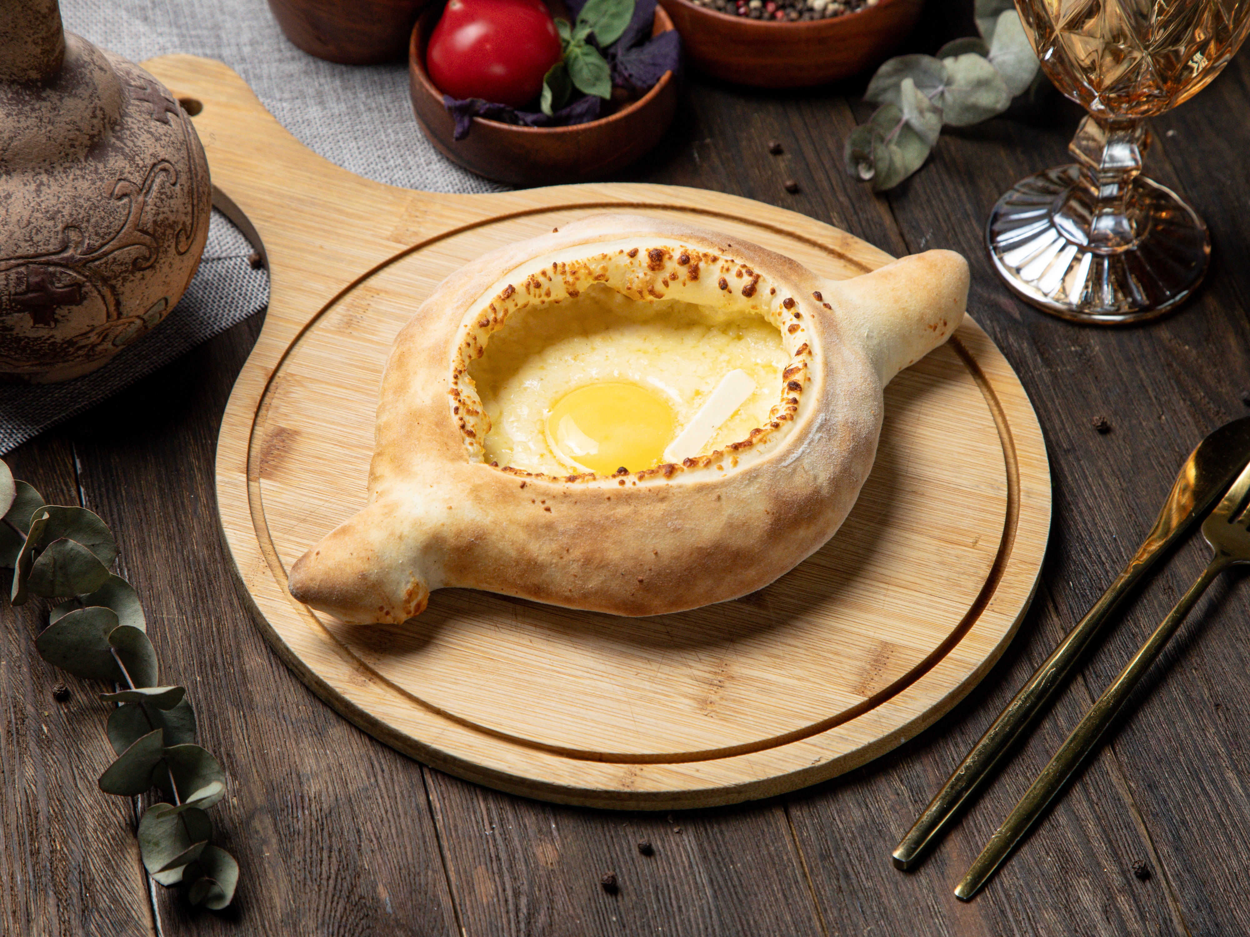 лодочка их хрустящего теста с сыром сулугуни. Подается с желтком и сливочным маслом.