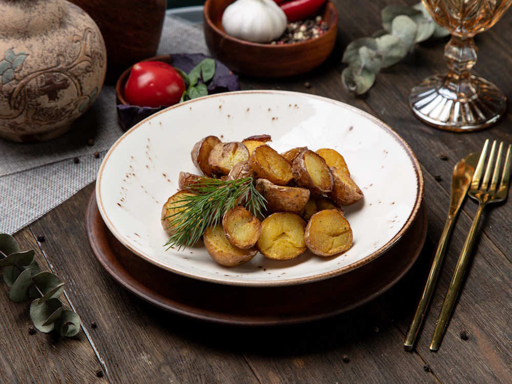 Свежий картофель обжаривается дольками во фритюре приправленный сванской солью