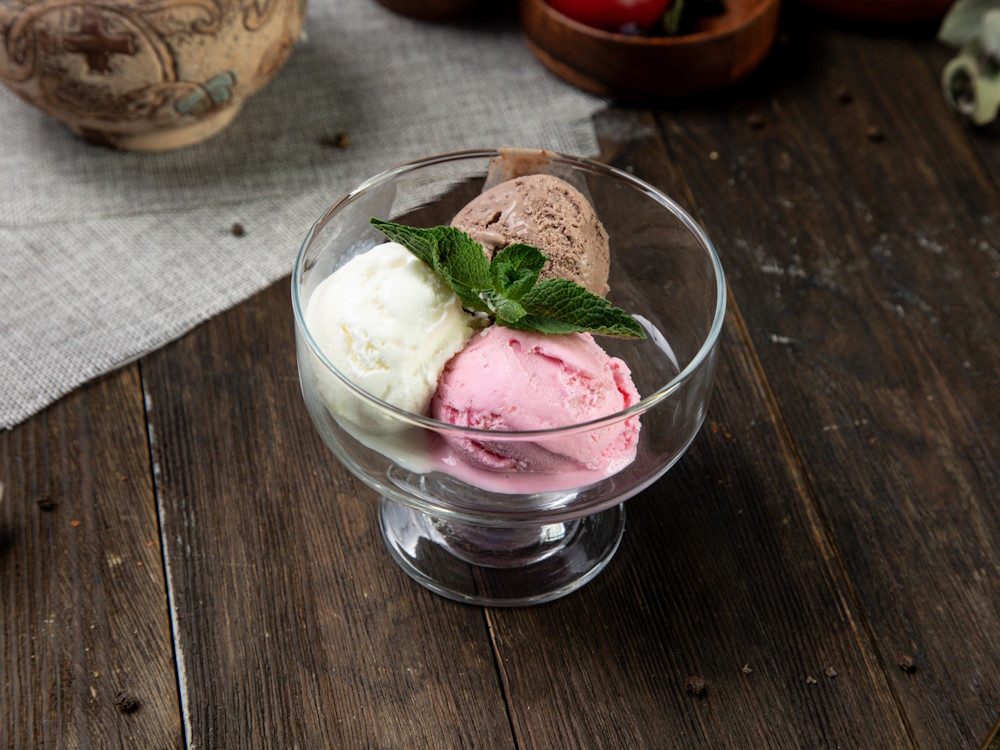 Можно выбрать разные шарики6 пломбир, шоколадное или клубничное