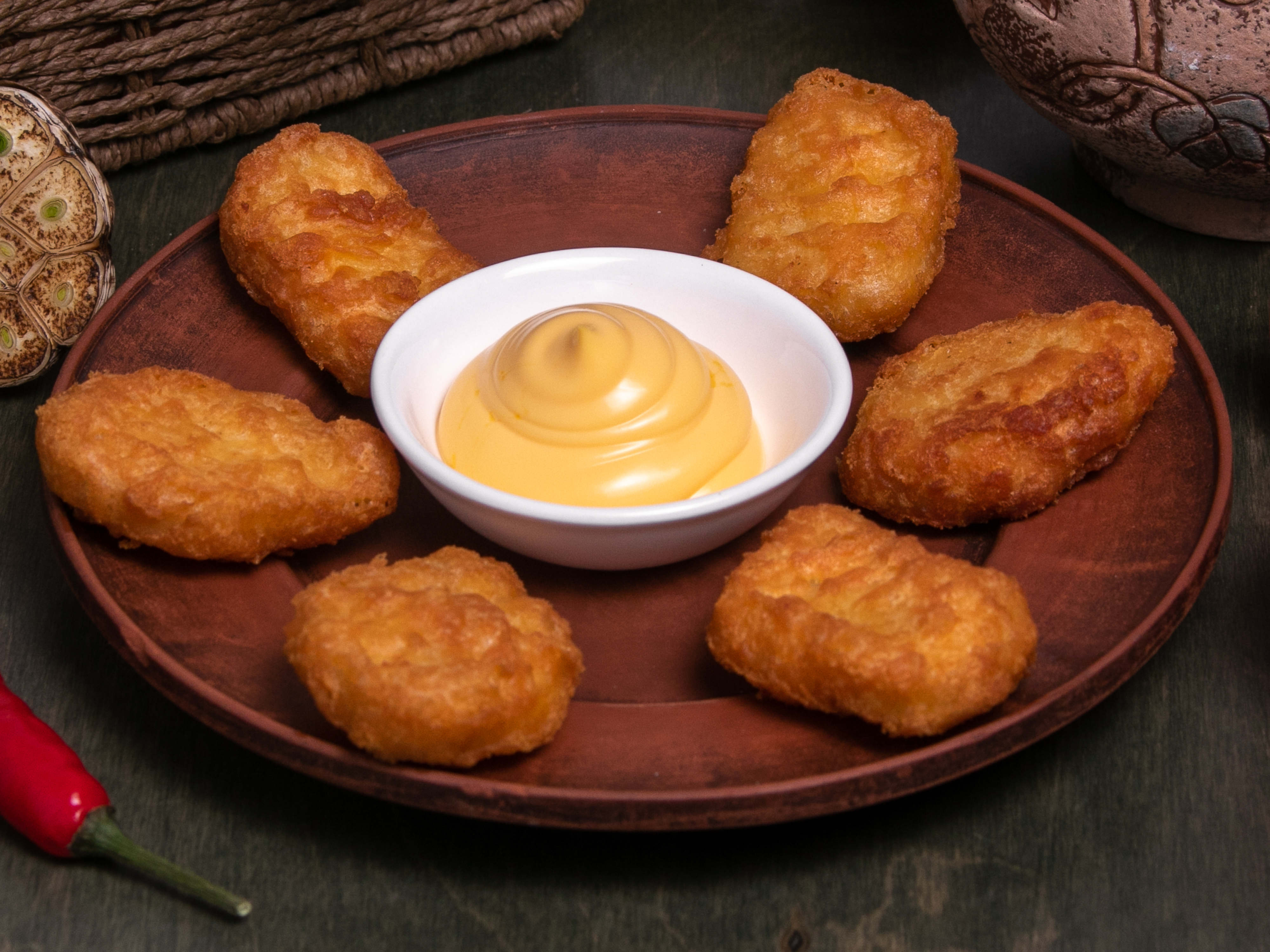 Куриные наггетсы собственного приготовления из нежного куриного филе в панировке, подаются с фирменным сырным соусом
