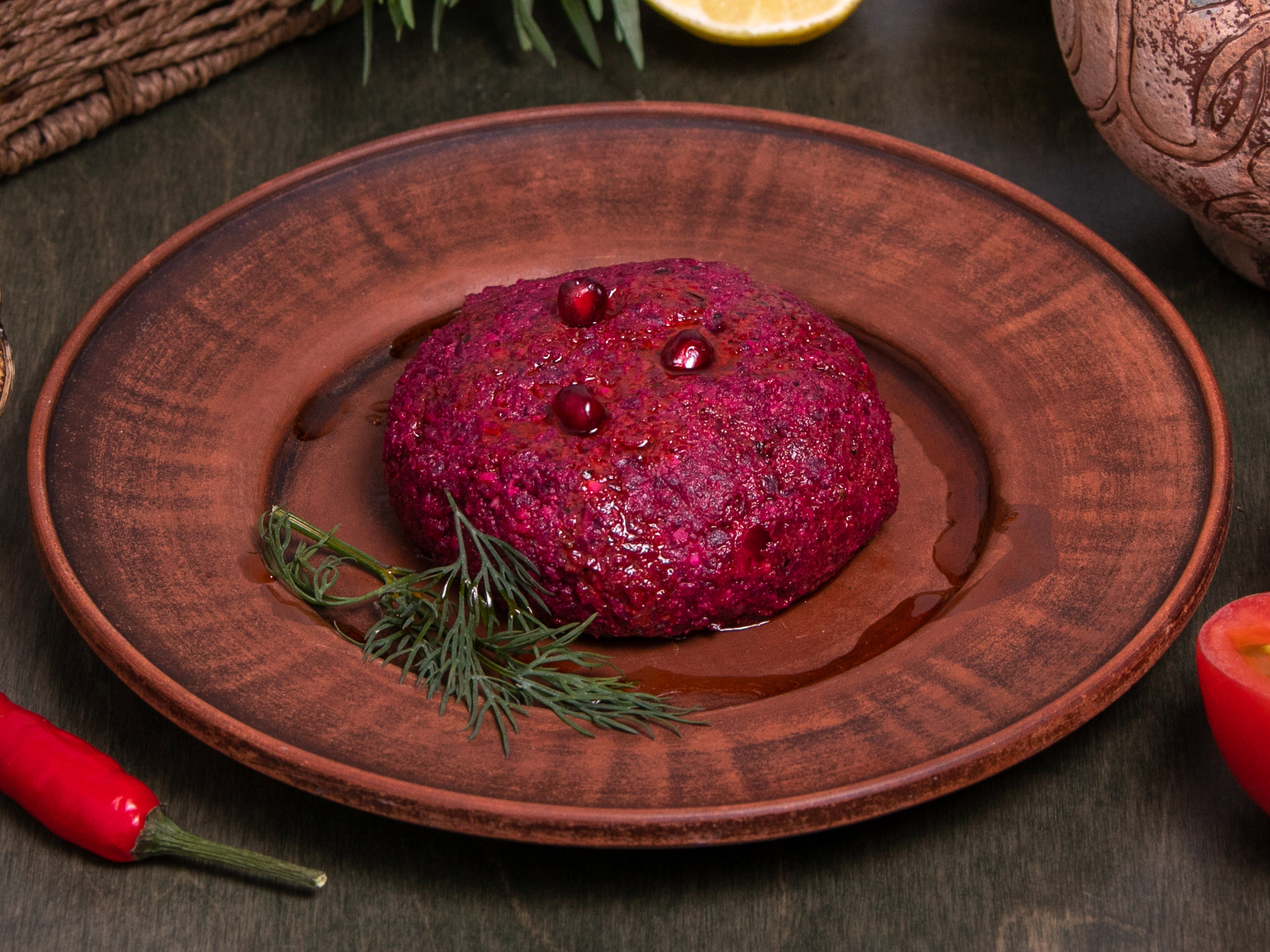 Протертая свекла с грецким орехом и чесноком, грузинскими специями, подается с чвиштари и джонджоли.