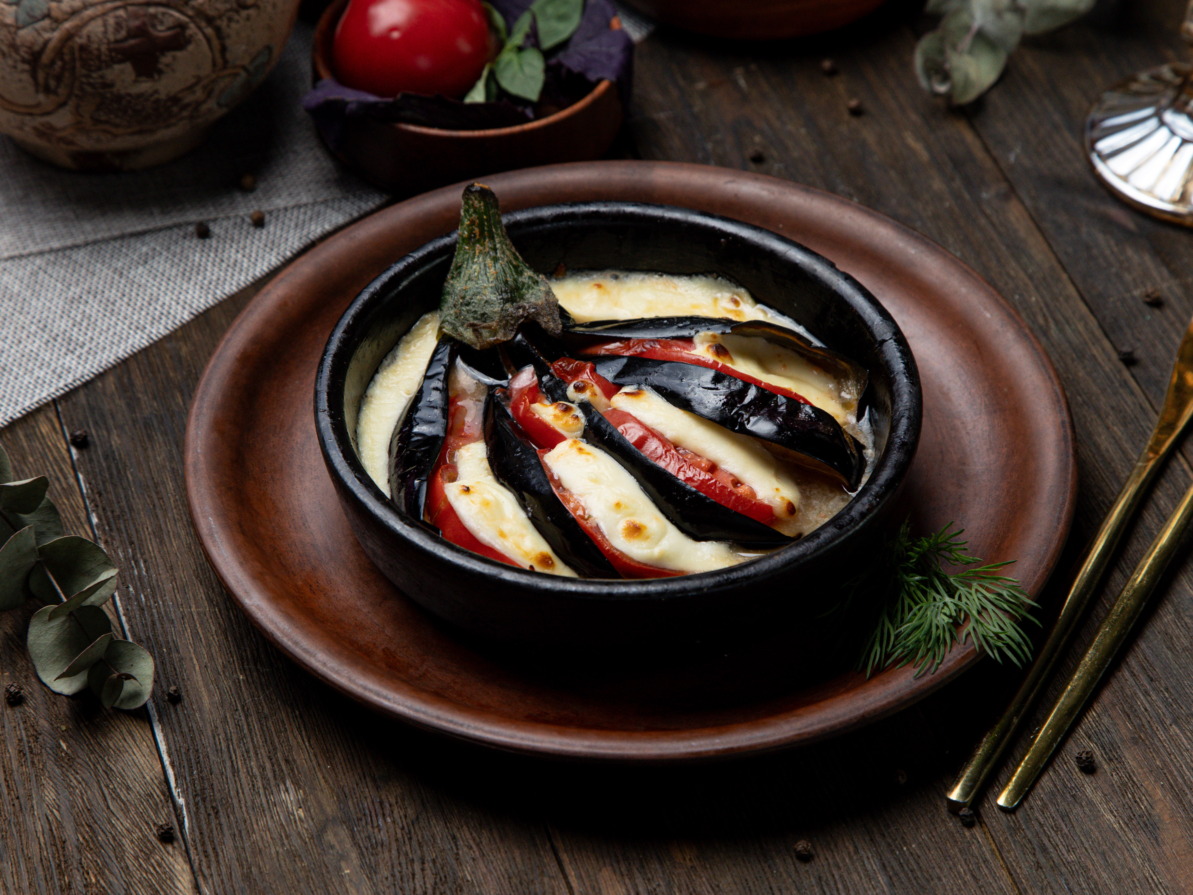Баклажан, помидоры, сыр cулугуни запеченные на кеци