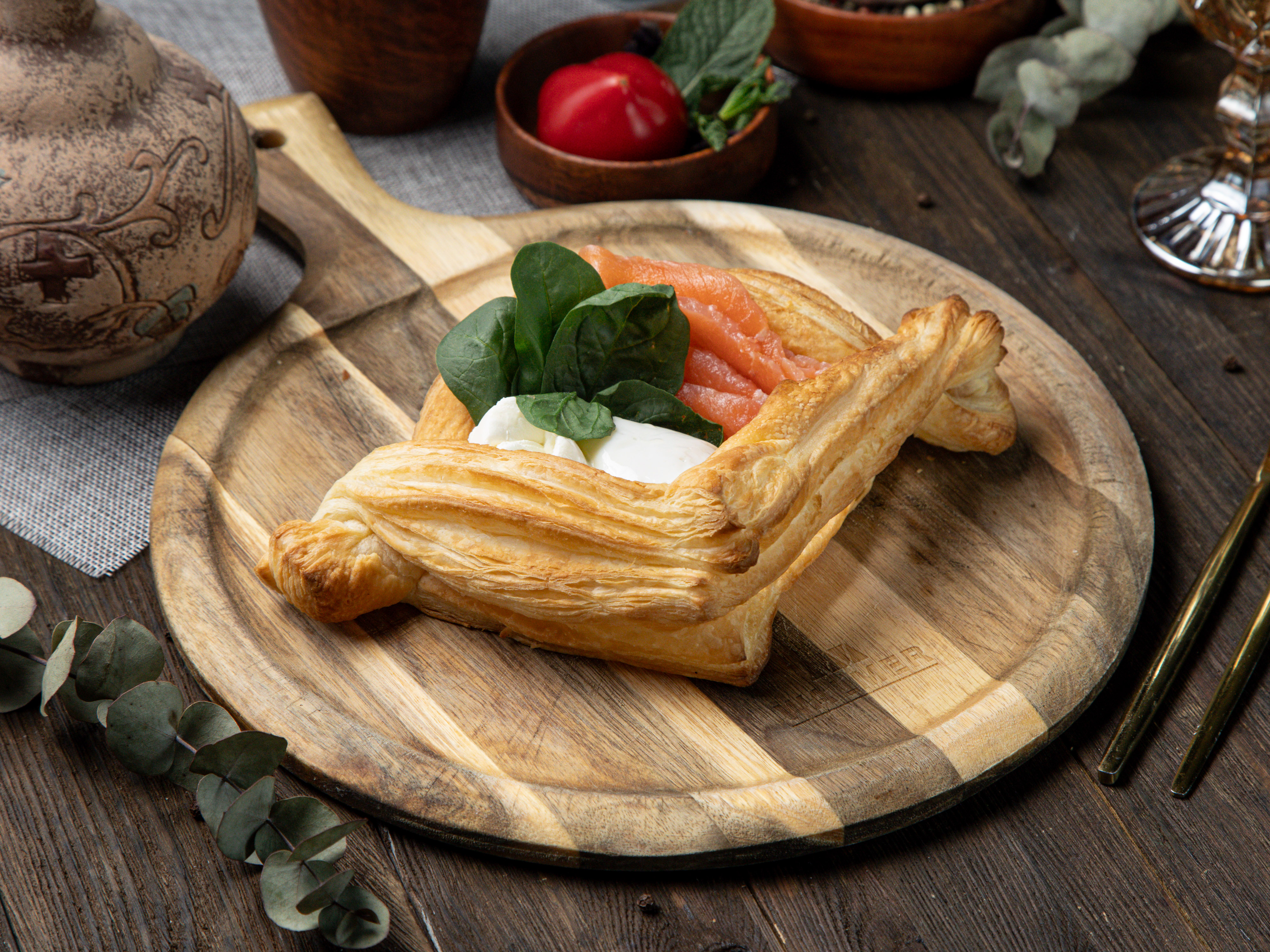 Яйцо пашот на слоёном хачапури со сливочным сыром, слабосолёным лососем и свежим миксом салатов.