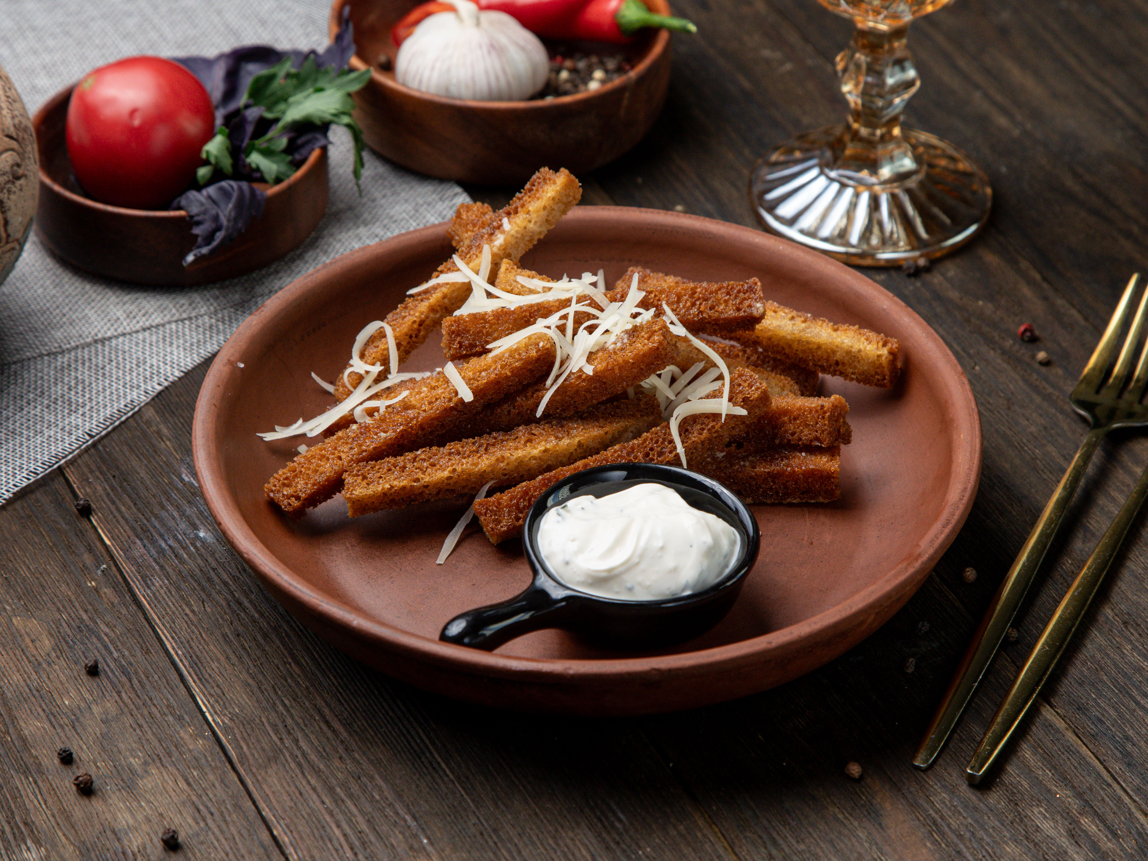 Обжаренные гренки из бородинского хлеба до хрустящей корочки с чесноком и каменной солью, подаются с чесночным coуcoм