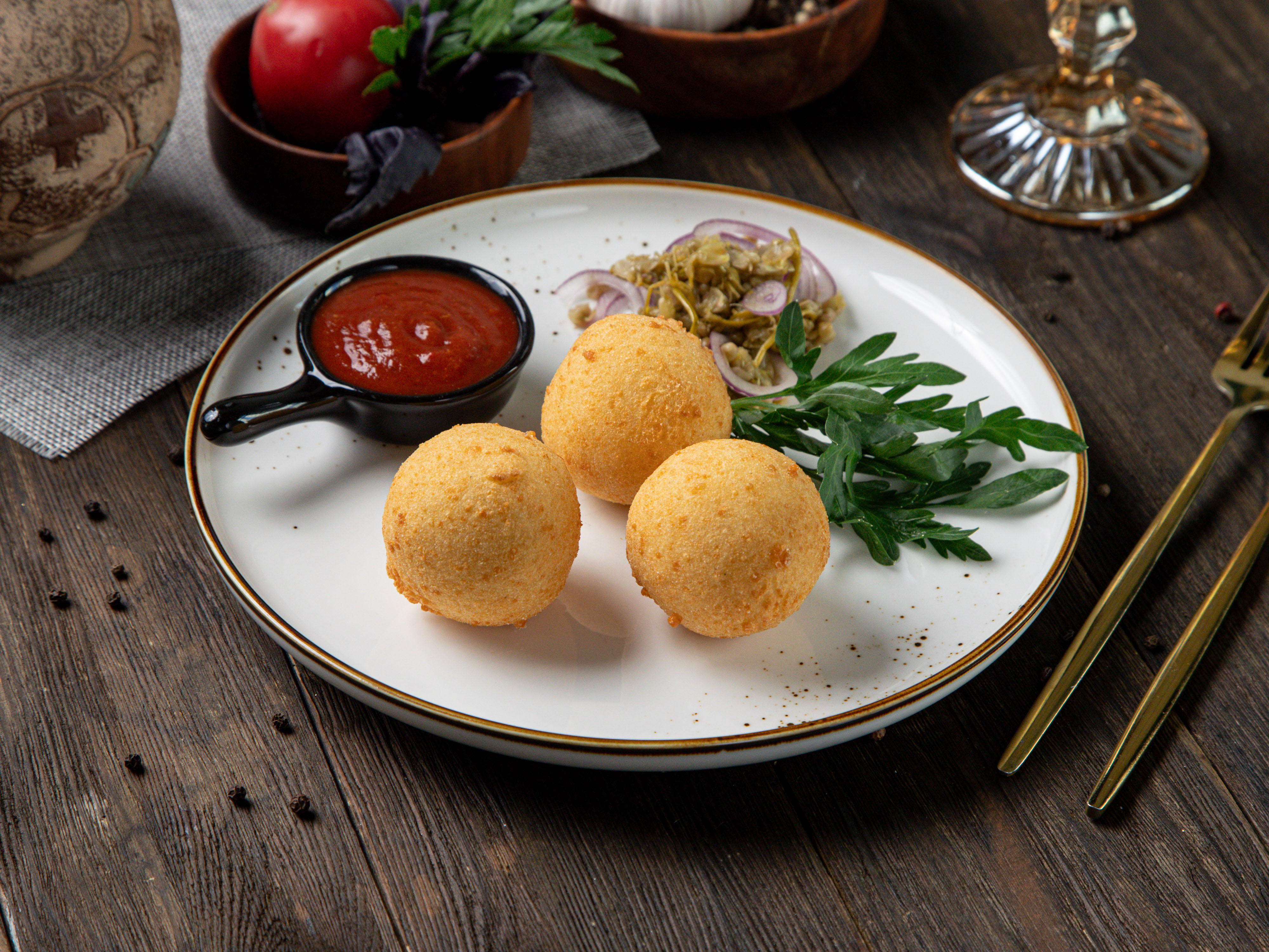 Запечённые шарики из сыра сулугуни с кукурузной мукой, подаётся с джонджоли, свежей зеленью и coуcoм сацебели