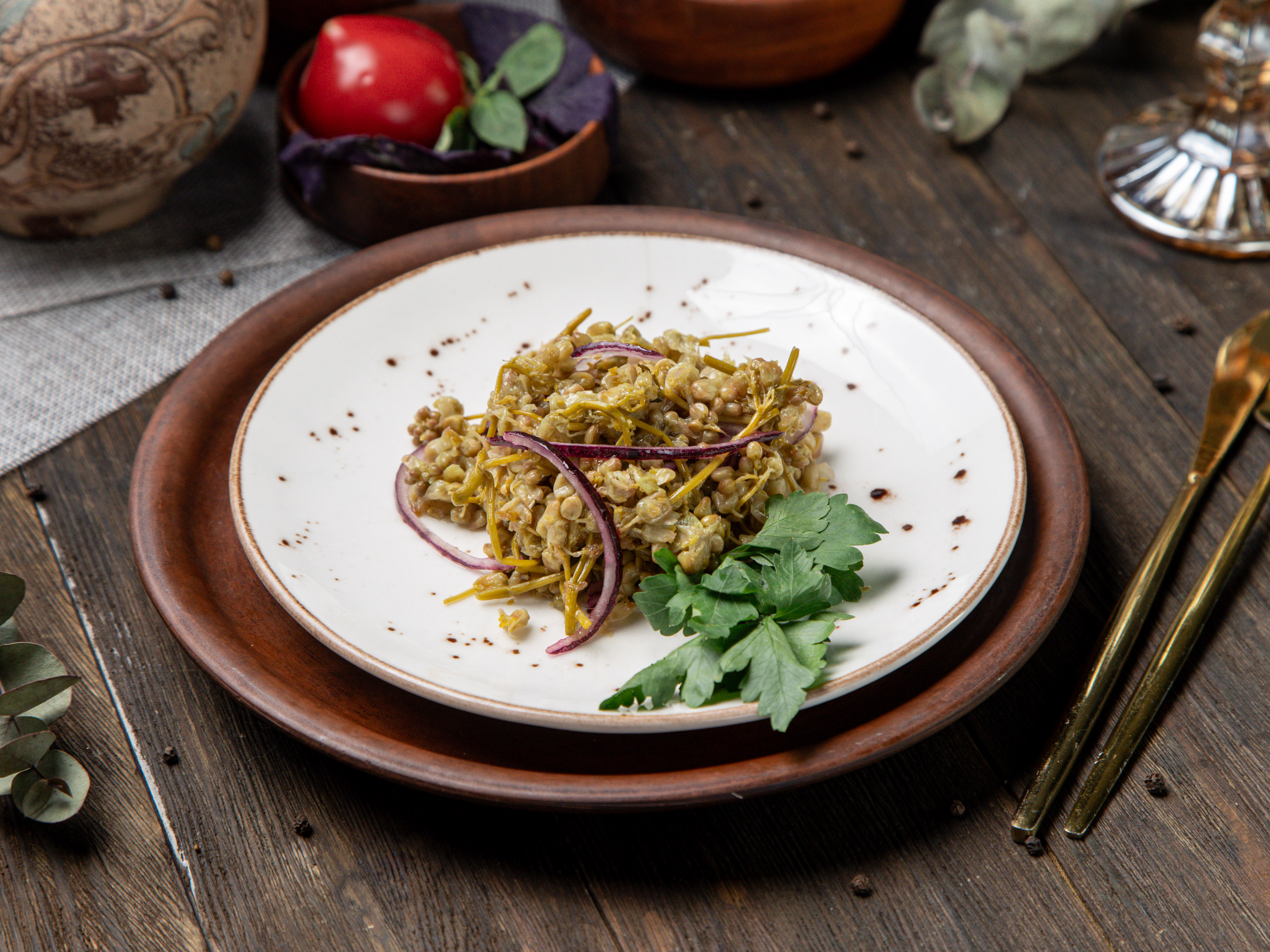 Маринованный бутон цветка акации, винный укcуc, ароматное масло и красный лук