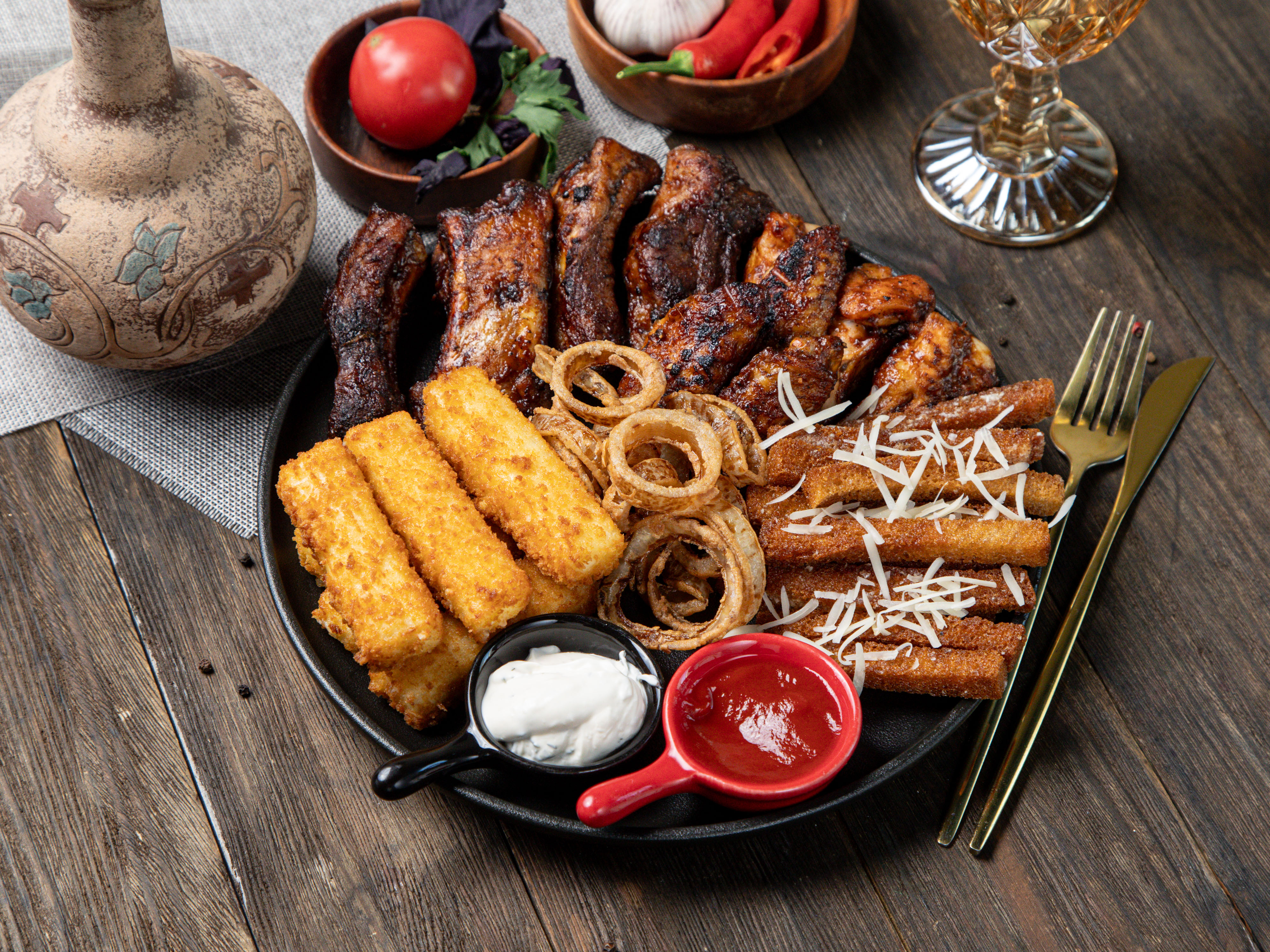 Свиные ребрышки барбекю, поджаренные куриные крылышки, хрустящие сырные палочки, чесночные гренки и луковые кольца, подается с coуcoм гриль, чесночным coуcoм, сырным coуcoми coуcoм сацебели
