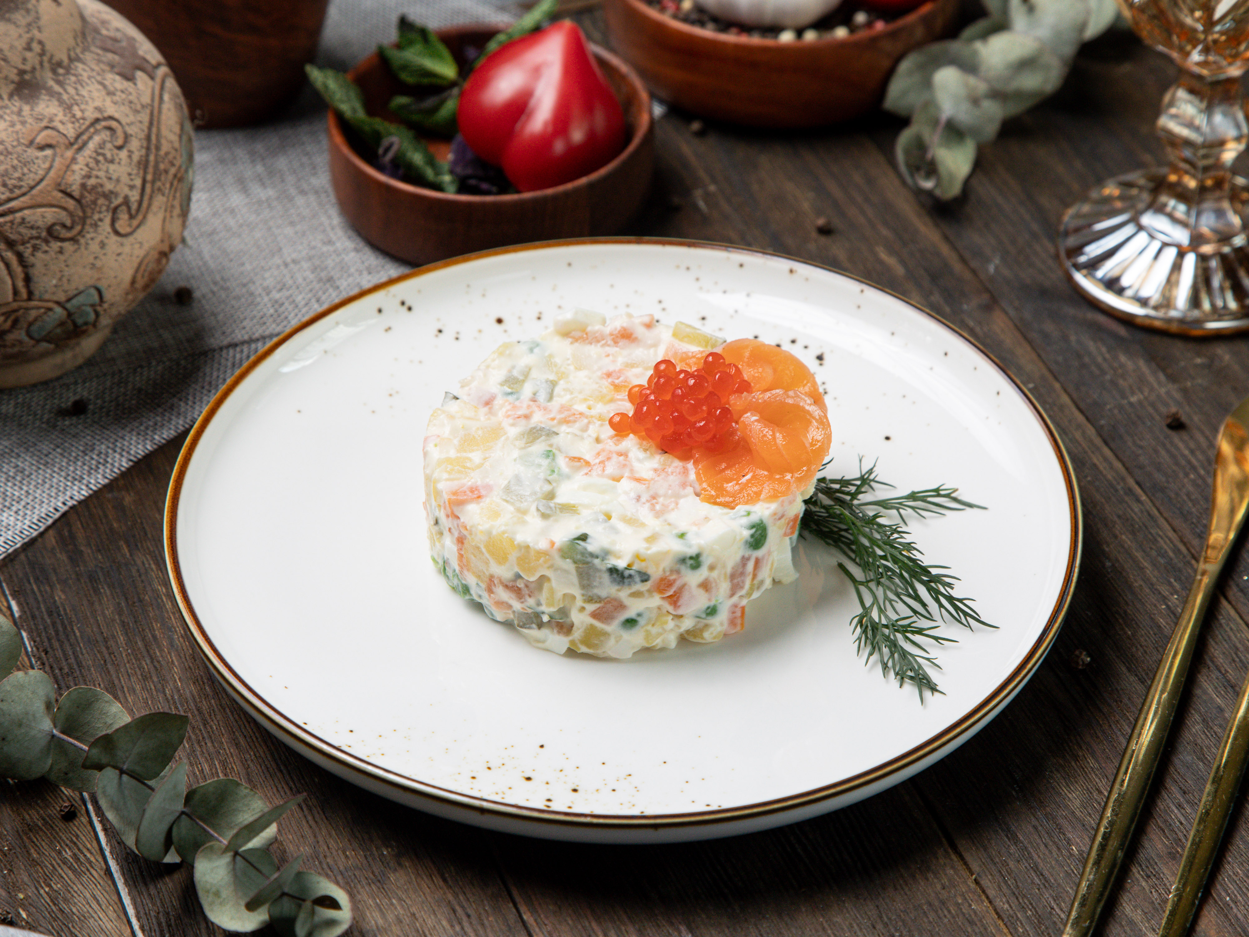 Оливье с семгой и красной икрой