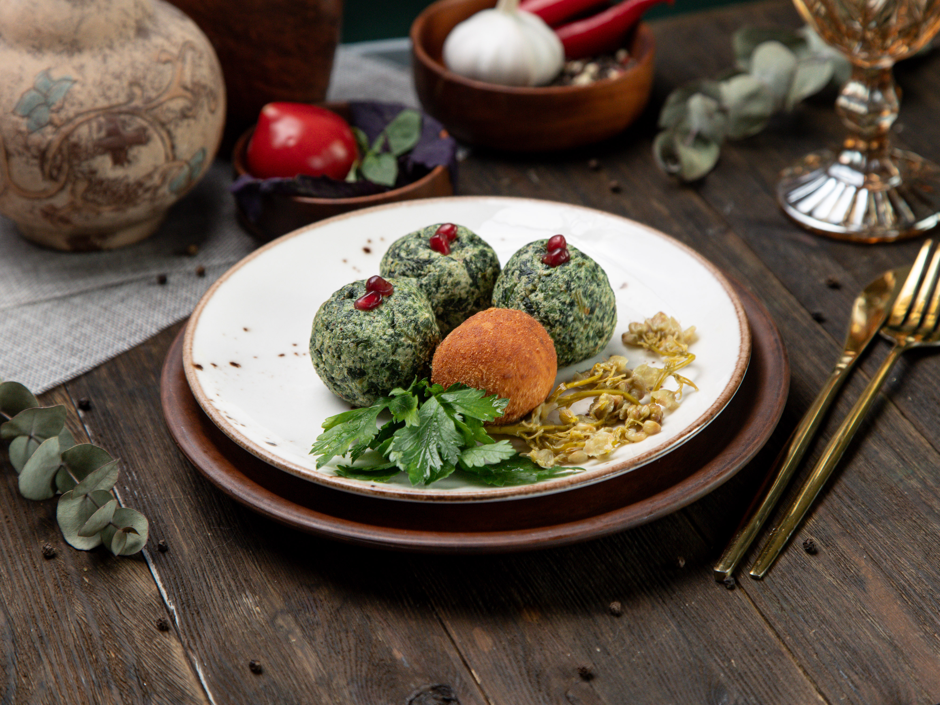 Протертый шпинат с грецким орехом и чесноком, грузинскими специями, подается с чвиштари и джонджоли.