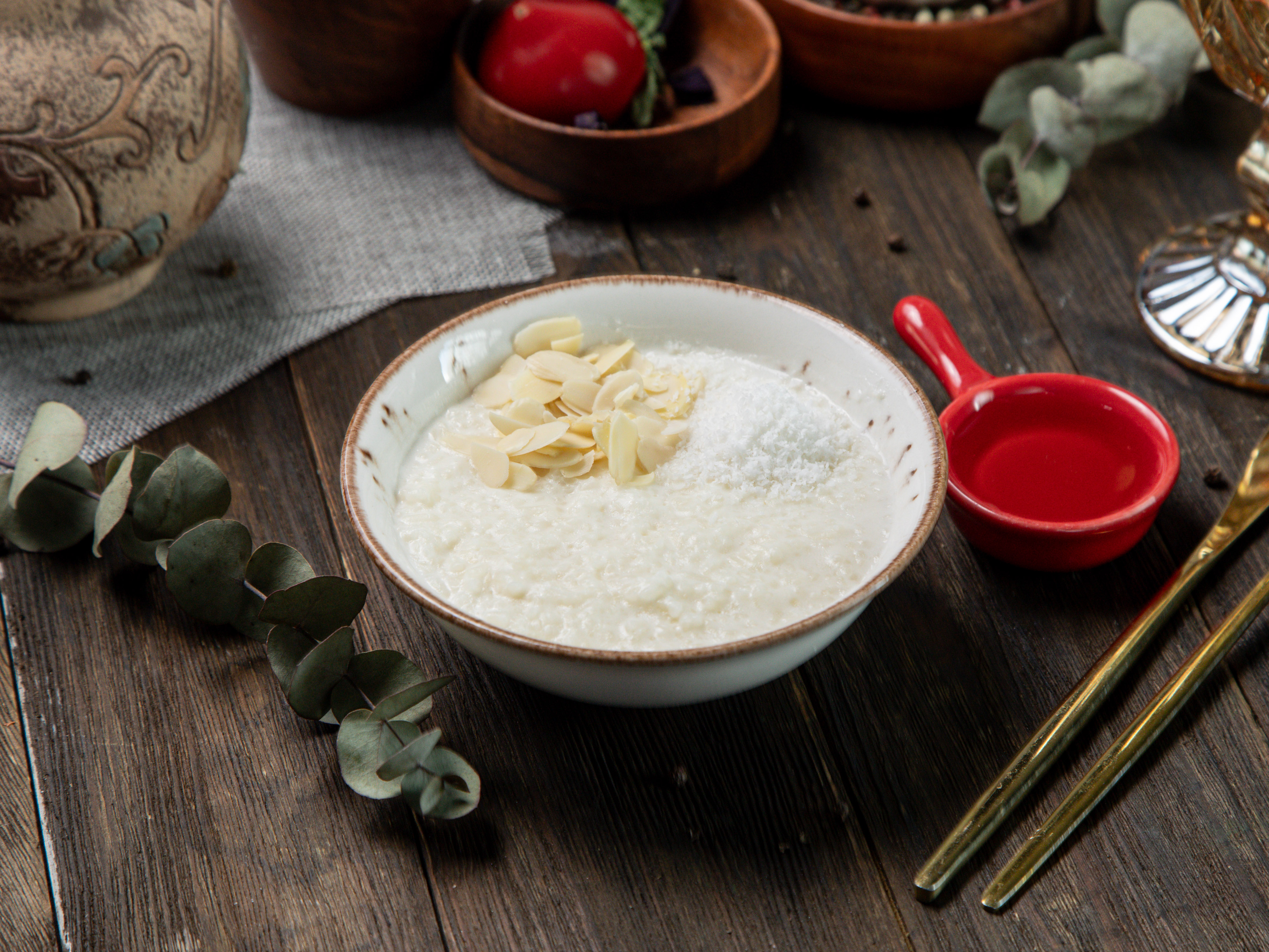 Рисовая каша на кокосовом молоке с миндальными лепестками и кокосовой стрgжкой, подается с медом.