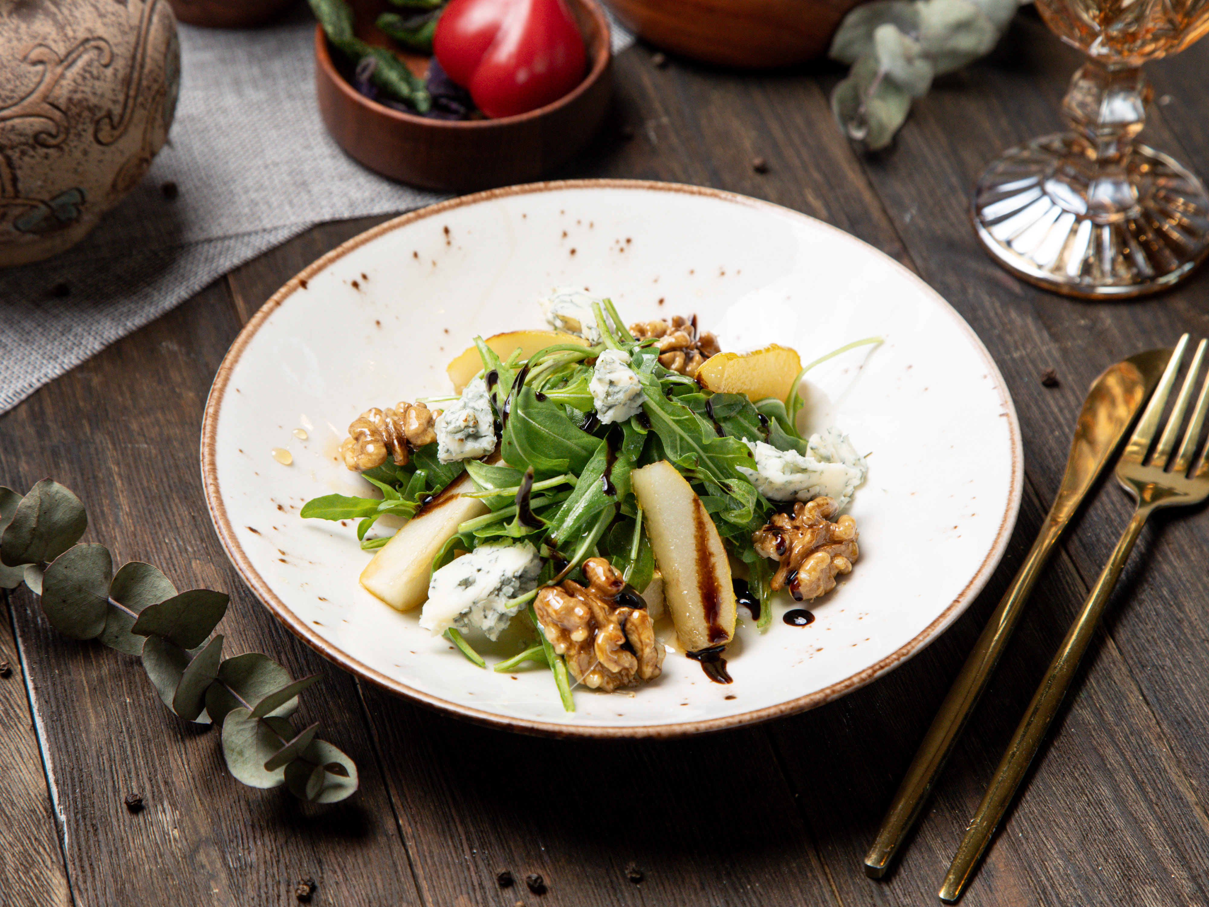 Национальный грузинский красочный салат с кусочками отварной нежной говядины, замешанной с ломтиками болгарского перца, красной фасолью и красным луком, приправленный грецким орехом и душистой кинзой