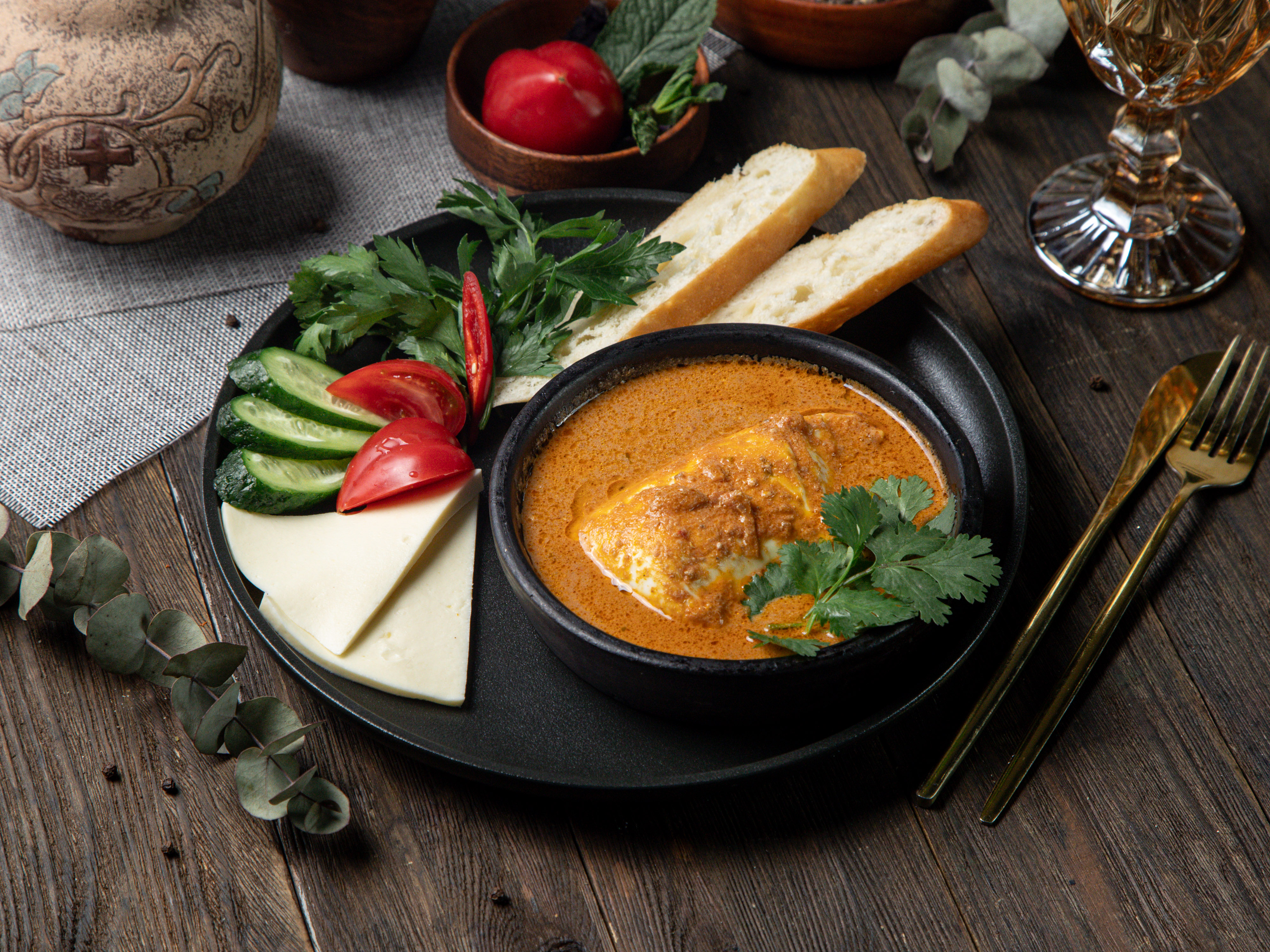 Традиционная грузинская яичница чирбули из двух яиц запечённых на кеци с добавлением coуca из свежих томатов, грецкого opexaи специй. Подается с пури, свежими помидорами, огурцом и сыром сулугуни.